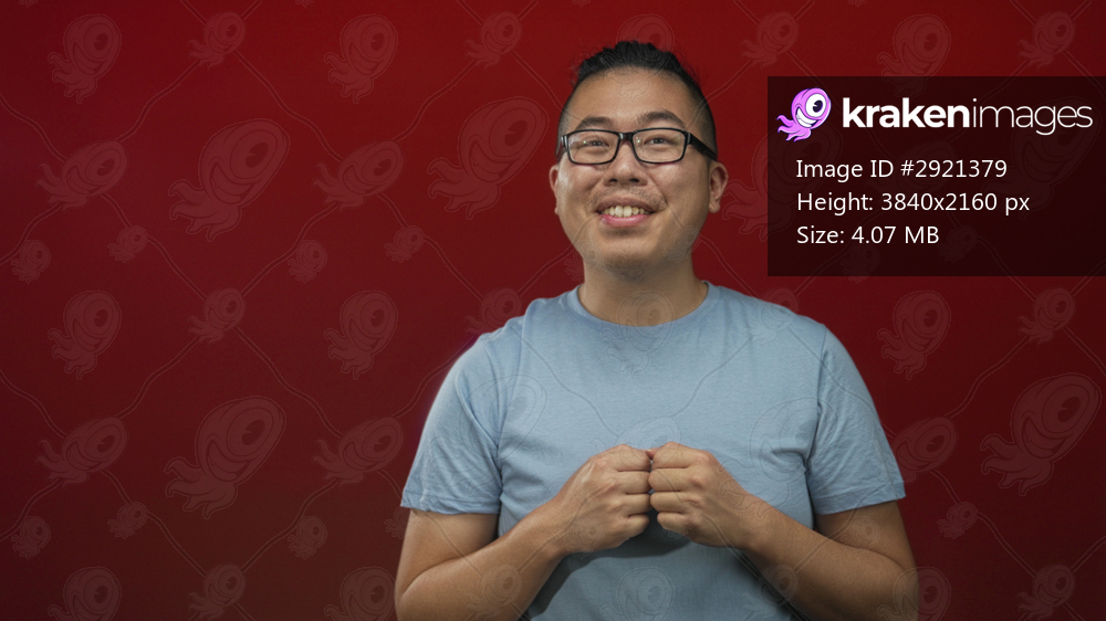 Man, young, wearing glasses and a blue tshirt with short hair, with clenched fists to chest in a red studio; joy.
