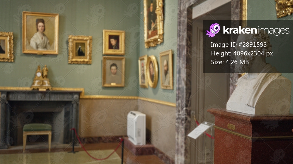 Marble bust in shallow focus with defocused paintings, gilded frames and muted tones in a soft gallery museum; background copyspace backplate.