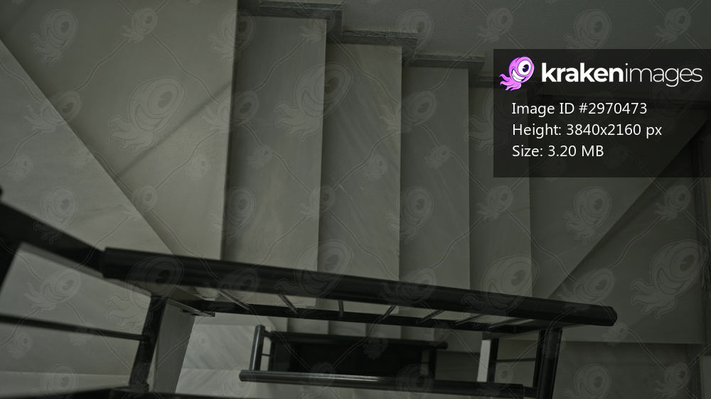Marble staircase seen from above with black metal handrail and descending steps in building; minimalist solitude.