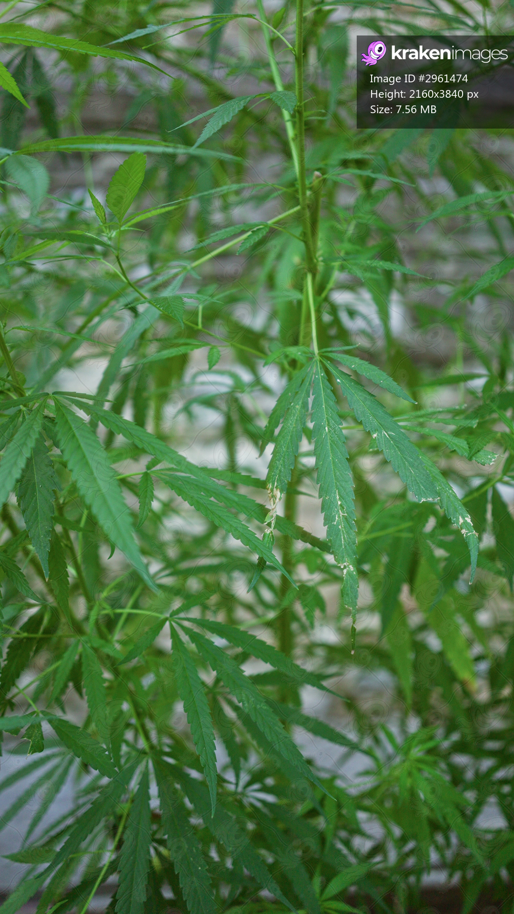 Marijuana plant with drooping serrated leaves and leaning stems against a building wall, vibrant green foliage; natural calm growth.