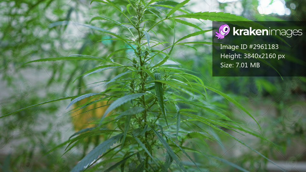Marijuana plant with narrow green leaves growing tall beside a building wall in an outdoor garden; cultivation calm.