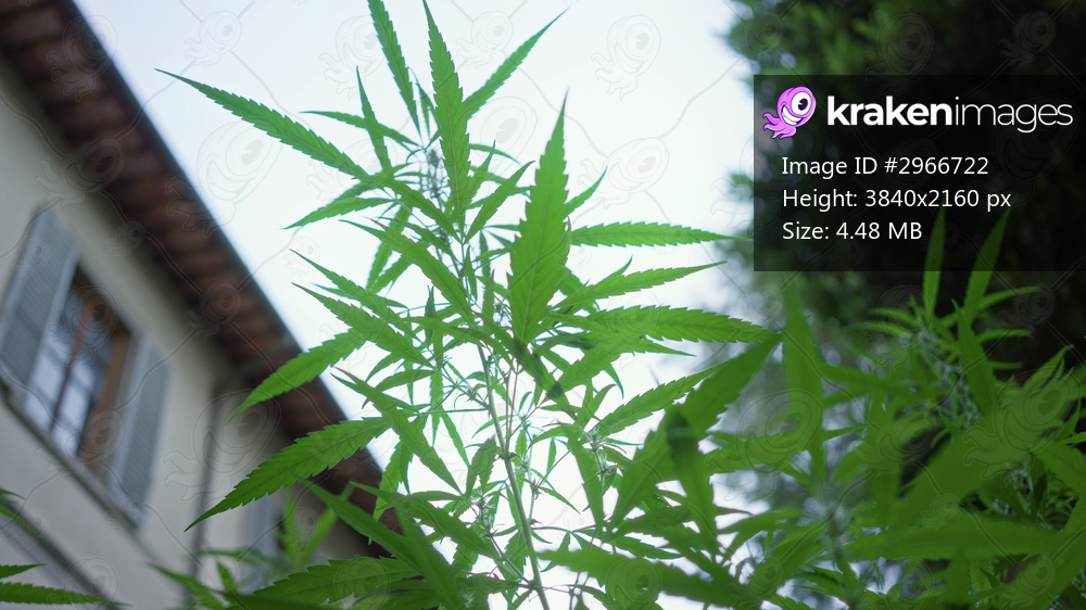 Marijuana plant with serrated green leaves leaning toward a building window, stems swaying under pale overcast sky; urban growth serenity.