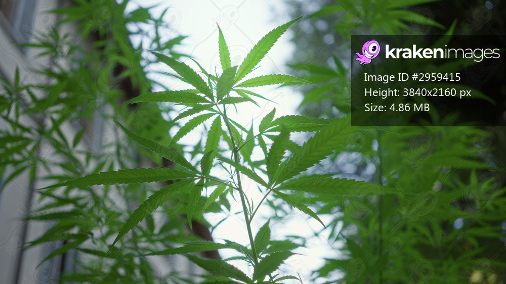 Marijuana plant with serrated leaves reaching toward the sky beside a building window, slender stems and layered foliage; serene growth.