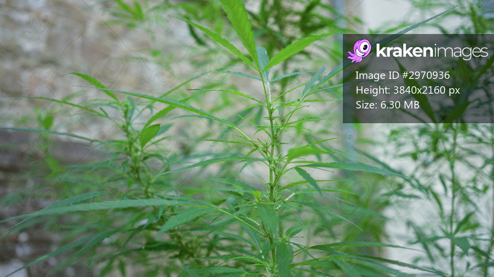 Marijuana plant with slender serrated leaves growing from a central stem, leaves reaching outward beside a weathered building wall; calm resilience.