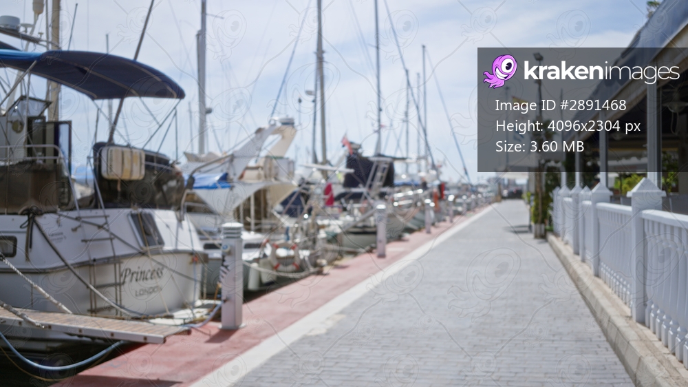 Marina promenade with docked sailboats and blurred masts along a waterfront walkway, soft defocused bokeh, outdoor; background backdrop copyspace calm.