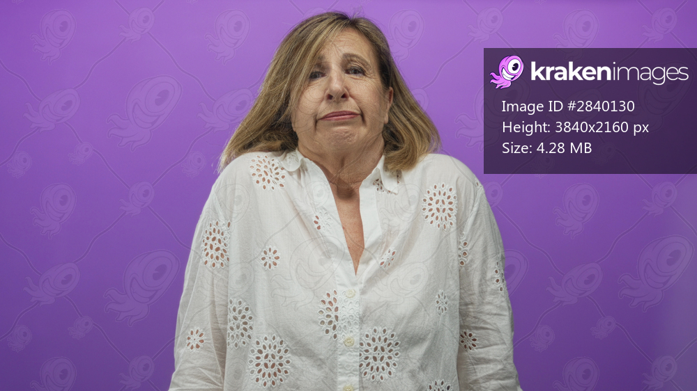 Mature caucasian woman wearing white eyelet blouse shrugs bare face in soft purple studio; resignation.