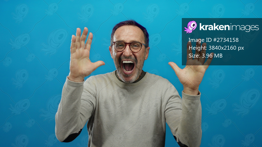 Mature hispanic man expressing joy and excitement with raised hands against a vibrant blue background, showcasing an enthusiastic and animated expression. - Kraken Images