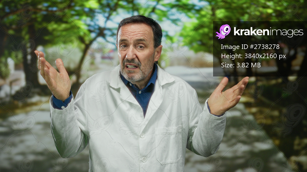 Mature hispanic man gestures outdoors in a sunny park setting, wearing a white lab coat with trees and sunlight in the background, conveying confusion or uncertainty. - Kraken Images