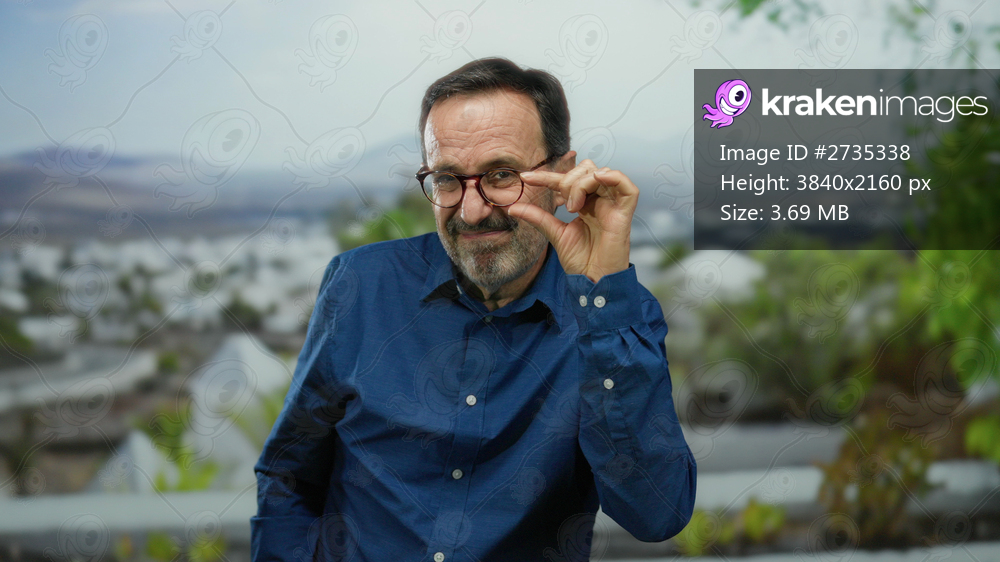 Mature hispanic man gesturing small size with hands in urban outdoor setting wearing blue shirt