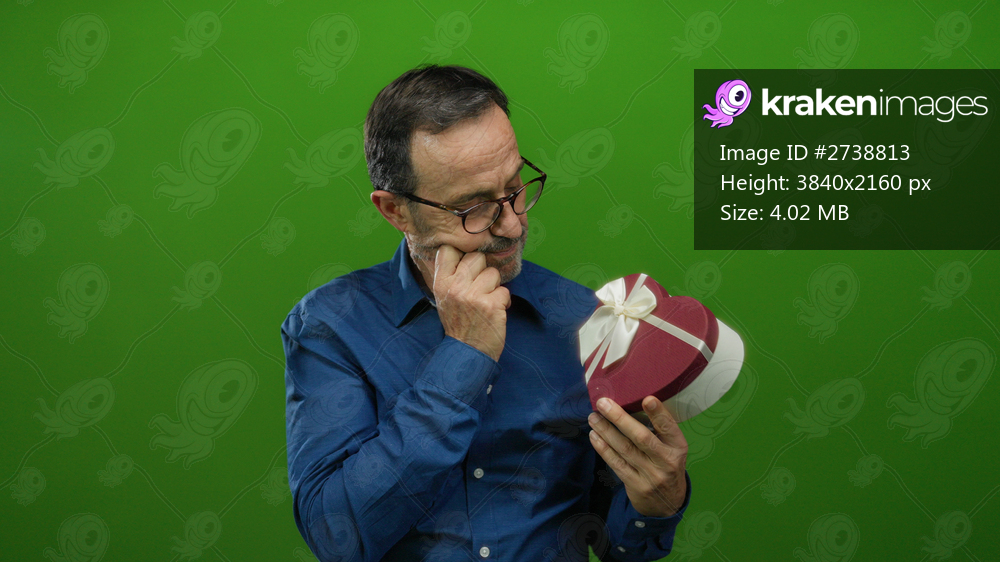Mature hispanic man in blue shirt holding red gift box against green wall thinking expression.