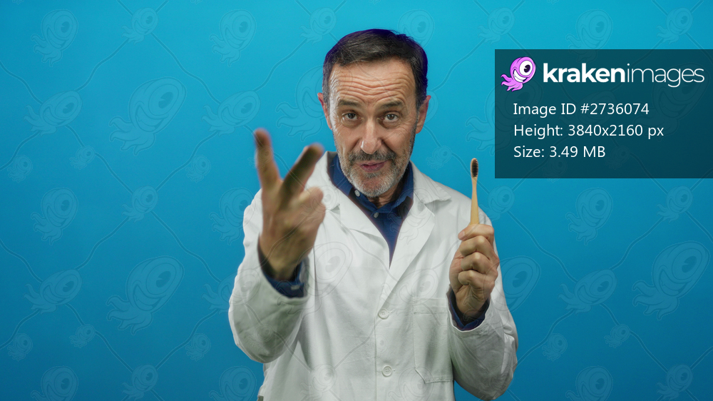 Mature hispanic man in white coat holding toothbrush confidently against blue background, gesturing and smiling, depicting dental care and professionalism. - Kraken Images