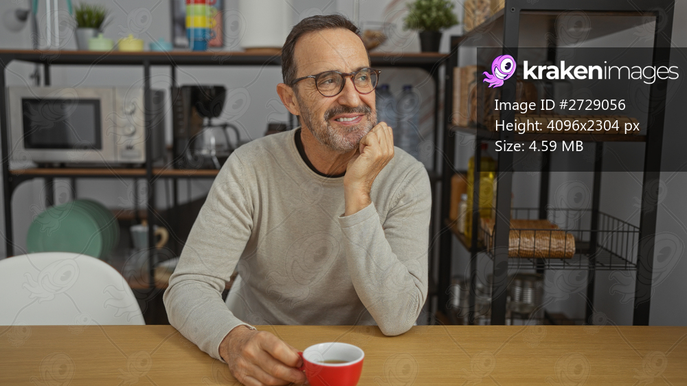 Mature hispanic man sitting indoors at a table in an office setting with a coffee mug, surrounded by shelves and modern decor, conveys a relaxed, professional atmosphere - Kraken Images