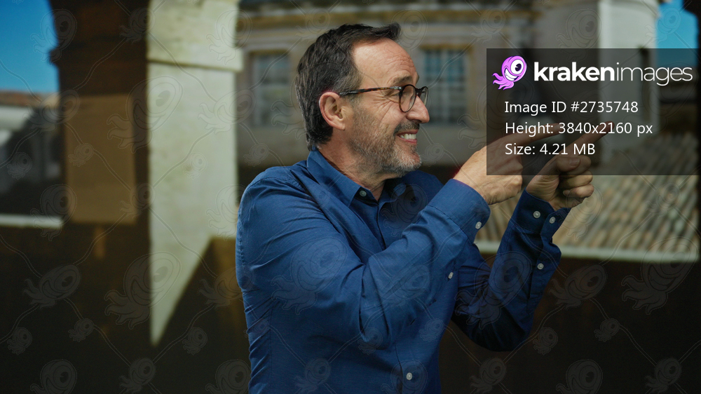 Mature hispanic man wearing glasses and a blue shirt points enthusiastically outdoors at a college campus, showcasing positive and engaging expression. - Kraken Images