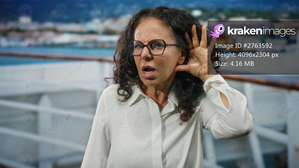 Mature hispanic woman with curly hair and glasses listens intently on a boat sailing near a scenic port.