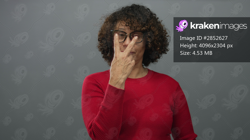 Mature hispanic woman wearing red sweater and eyeglasses makes gesture with hand in studio gray wall; peace harmony unity.