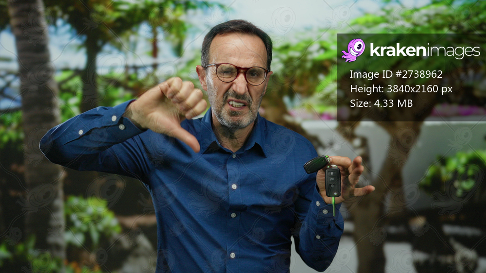 Mature man expressing disappointment with a thumbs-down gesture holding car keys in a lush green outdoor park setting.