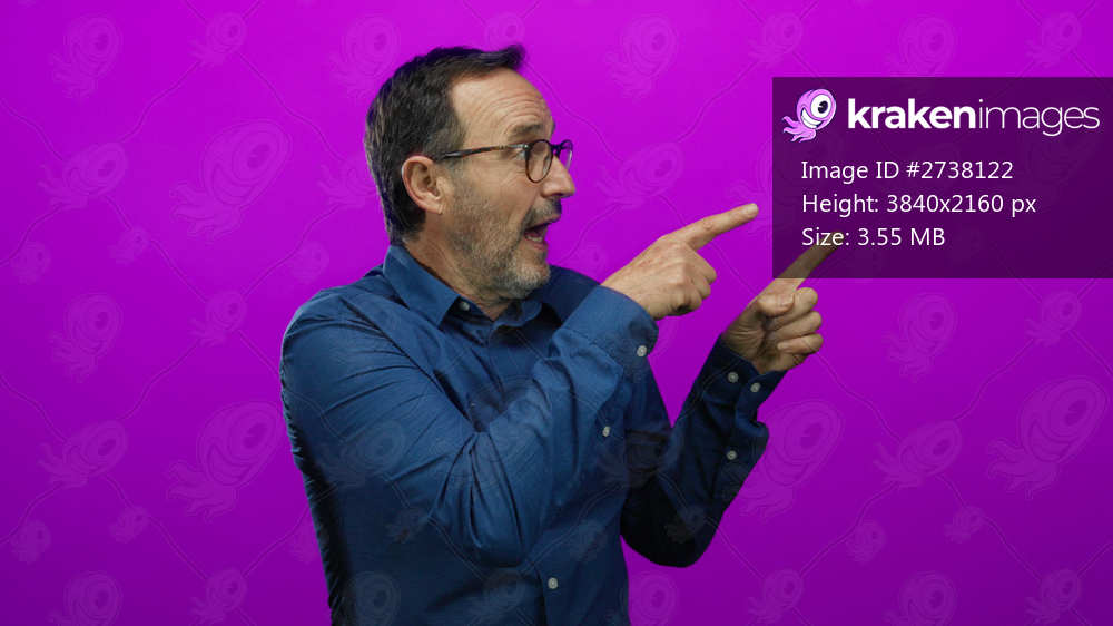 Mature man with glasses enthusiastically pointing on a vibrant pink background wearing a blue shirt.