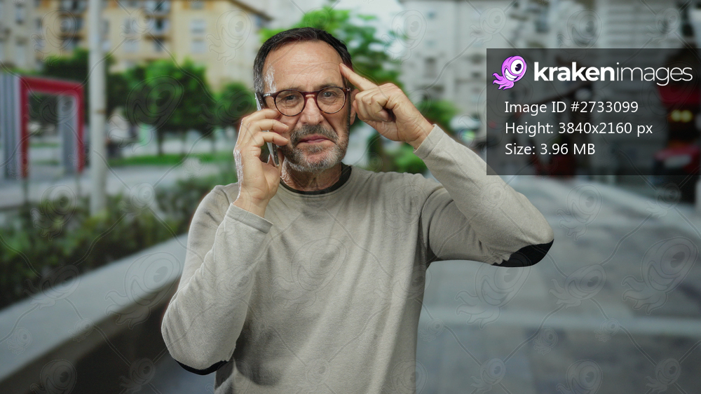 Mature man with glasses stands on city street making thinking gesture while talking on smartphone, surrounded by urban buildings and greenery.