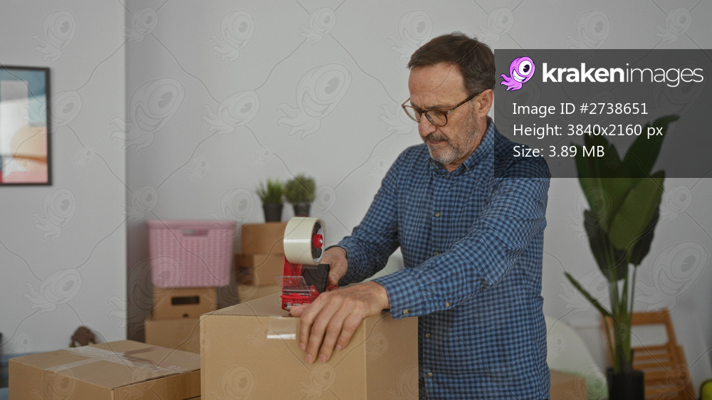 Mature man in living room packing boxes while preparing for a move highlighting home lifestyle and organization
