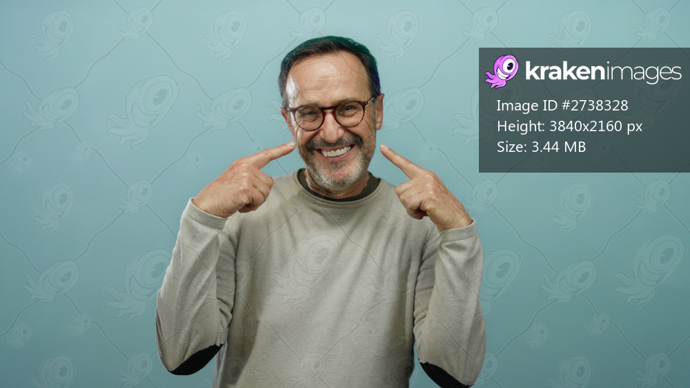 Mature man pointing to his smile while standing against a plain blue background, expressing happiness with his gesture and facial expression.