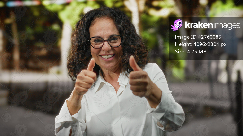 Mature woman with curly hair and glasses giving a thumbs-up gesture on a city street, exuding confidence and happiness outdoors.