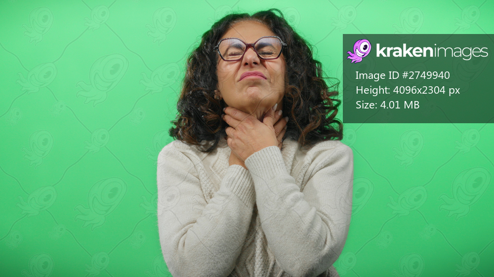 Mature woman with curly hair and glasses touches her neck against an isolated green background, expressing discomfort and concern, wearing a cozy sweater. - Kraken Images