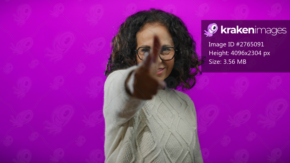 Mature woman with curly hair makes a playful finger gun gesture against a vibrant purple background, expressing confidence and joy.
