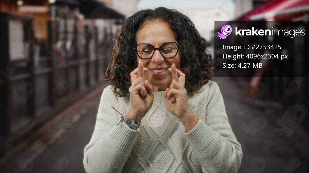 Mature woman with curly hair smiling with fingers crossed as she stands outside at a cozy restaurant terrace on a bright day, wearing a cream sweater and glasses. - Kraken Images