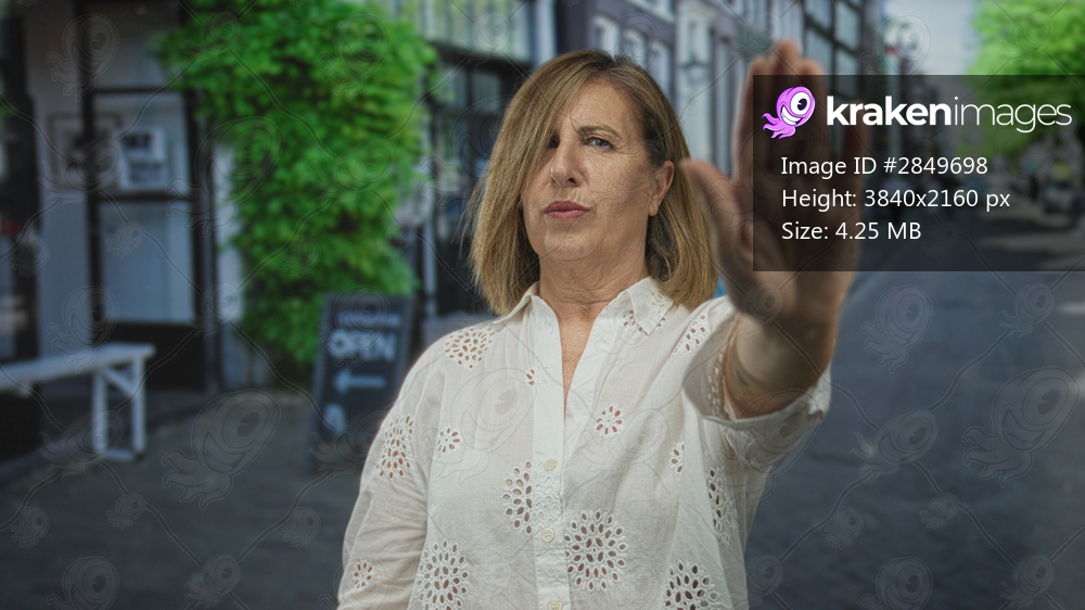 Mature woman holds hand raised palm outward on sunlit cobblestone street lined with green foliage and blurred building facades; defiance.