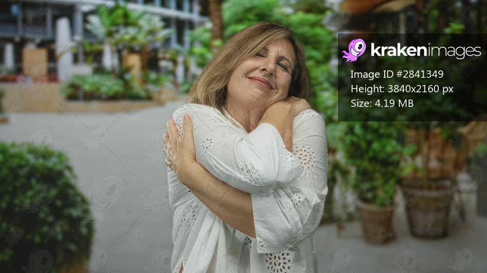 Mature woman smiling and hugging her arms on a tree lined street in front of potted plants; self care love contentment.