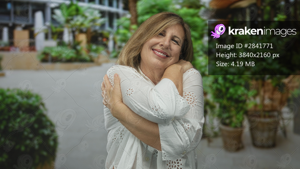 Mature woman smiling and hugging her arms on a tree lined street in front of potted plants; self care love contentment.