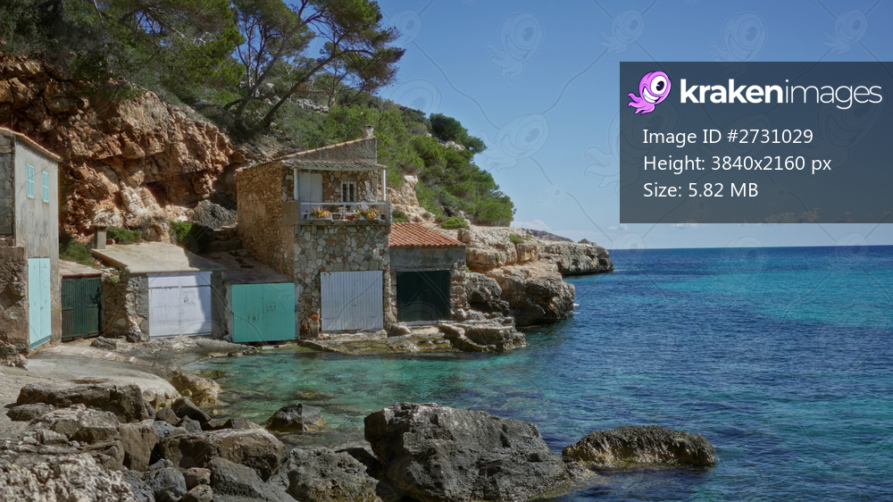 Mediterranean beach house nestled by rocky shore with turquoise water in cala llombards, mallorca, spain, surrounded by lush greenery and bright blue sky, capturing serene coastal beauty. - Kraken Images