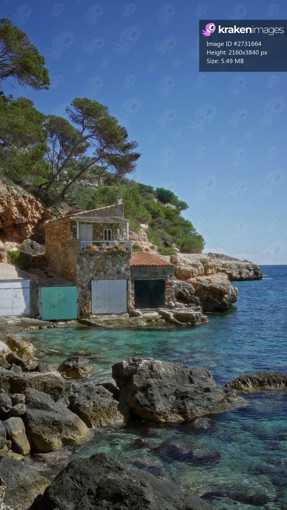 Mediterranean beach house nestled on cala llombards coast in mallorca bathed in sunlight against a backdrop of azure waters and rocky cliffs surrounded by lush evergreen trees. - Kraken Images