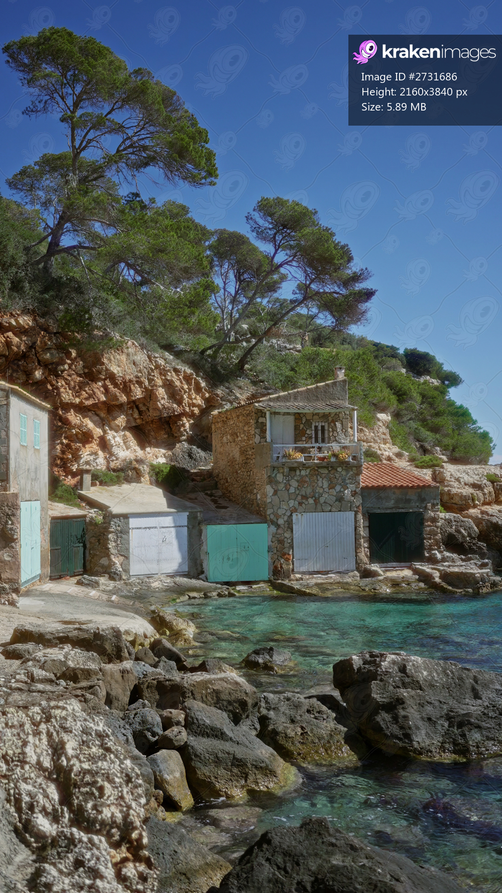 Mediterranean beach house nestled on cala llombards coast in mallorca bathed in sunlight against a backdrop of azure waters and rocky cliffs surrounded by lush evergreen trees. - Kraken Images