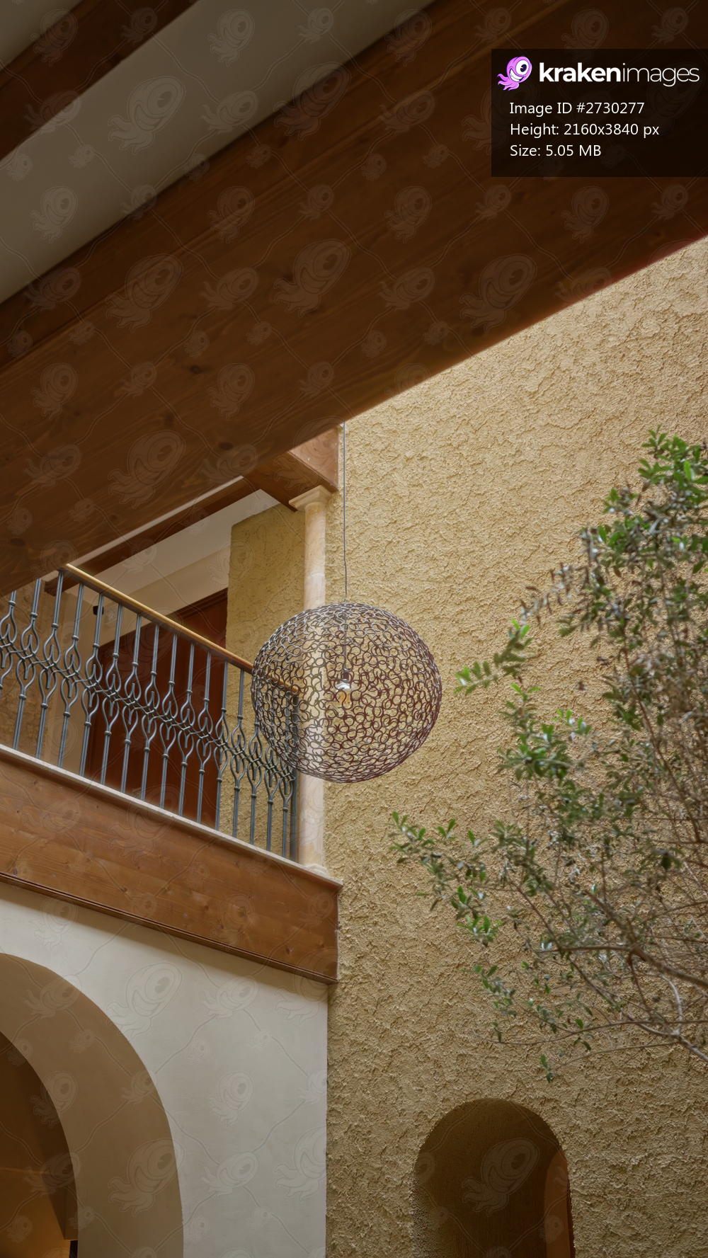 Mediterranean restaurant interior with rustic architecture, featuring wooden beams, a spherical pendant light, iron railing, arched doorways, and olive tree. - Kraken Images