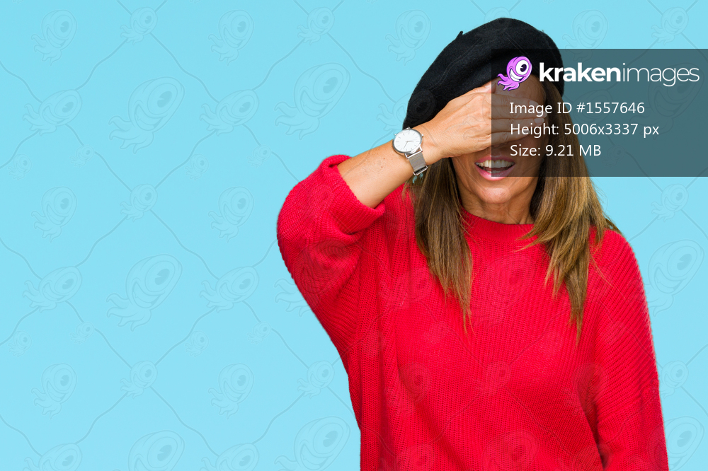 Middle age adult woman wearing fashion beret over isolated background smiling and laughing with hand on face covering eyes for surprise. Blind concept. - Kraken Images