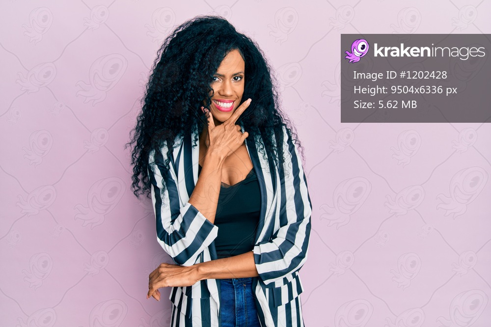 Middle age african american woman wearing casual clothes looking confident at the camera smiling with crossed arms and hand raised on chin. thinking positive. - Kraken Images