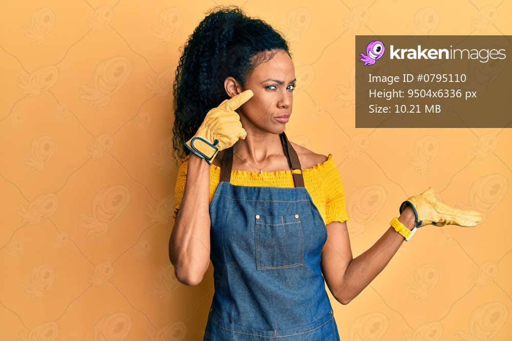 Middle age african american woman wearing professional apron confused and annoyed with open palm showing copy space and pointing finger to forehead. think about it. - Kraken Images