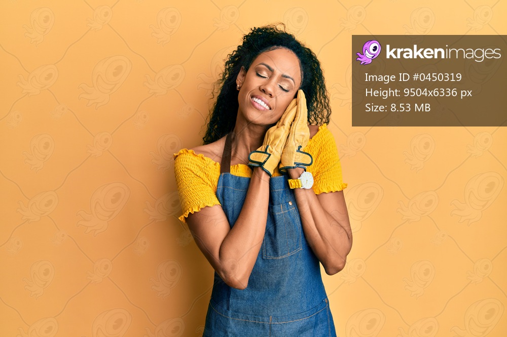 Middle age african american woman wearing professional apron sleeping tired dreaming and posing with hands together while smiling with closed eyes.