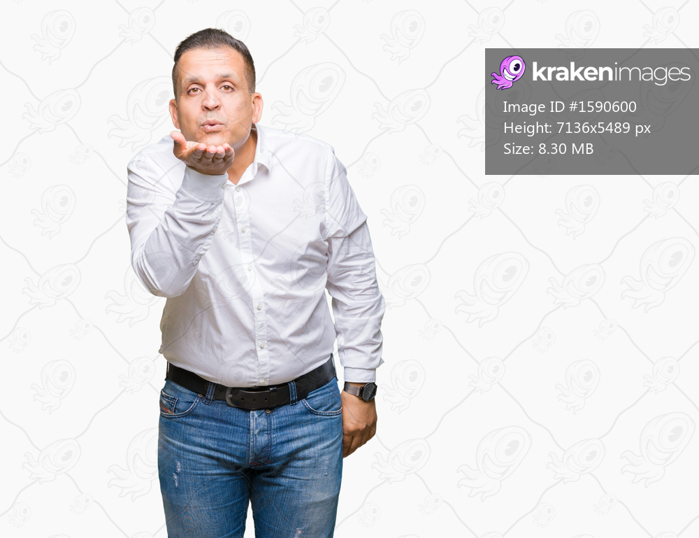 Middle age arab elegant man over isolated background looking at the camera blowing a kiss with hand on air being lovely and sexy. Love expression.
