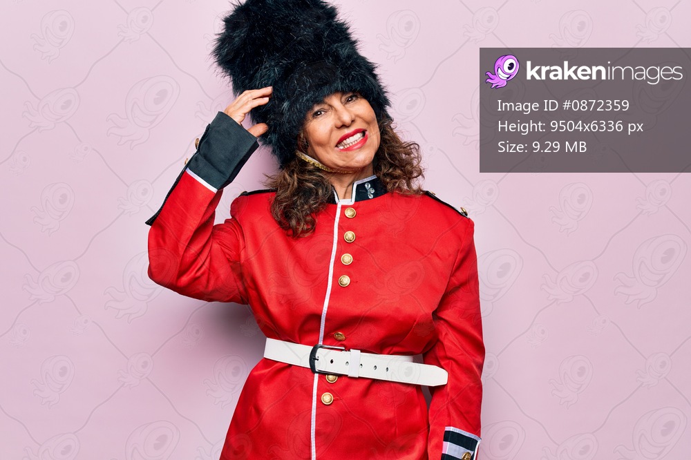 Middle age beautiful wales guard woman wearing traditional uniform over pink background confuse and wonder about question. Uncertain with doubt, thinking with hand on head. Pensive concept. - Kraken Images