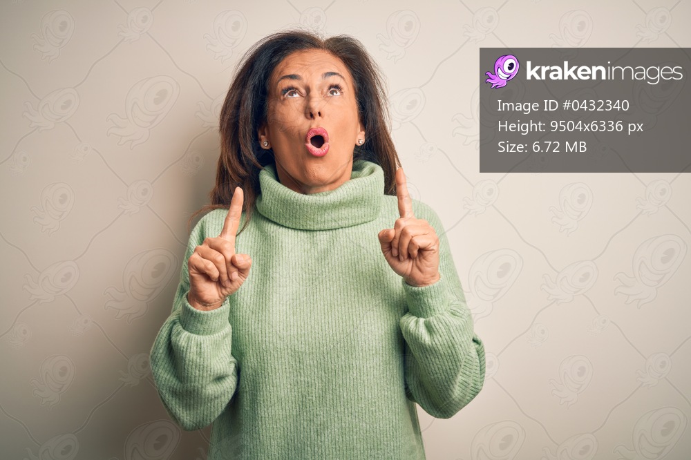 Middle age beautiful woman wearing casual turtleneck sweater over isolated white background amazed and surprised looking up and pointing with fingers and raised arms. - Kraken Images