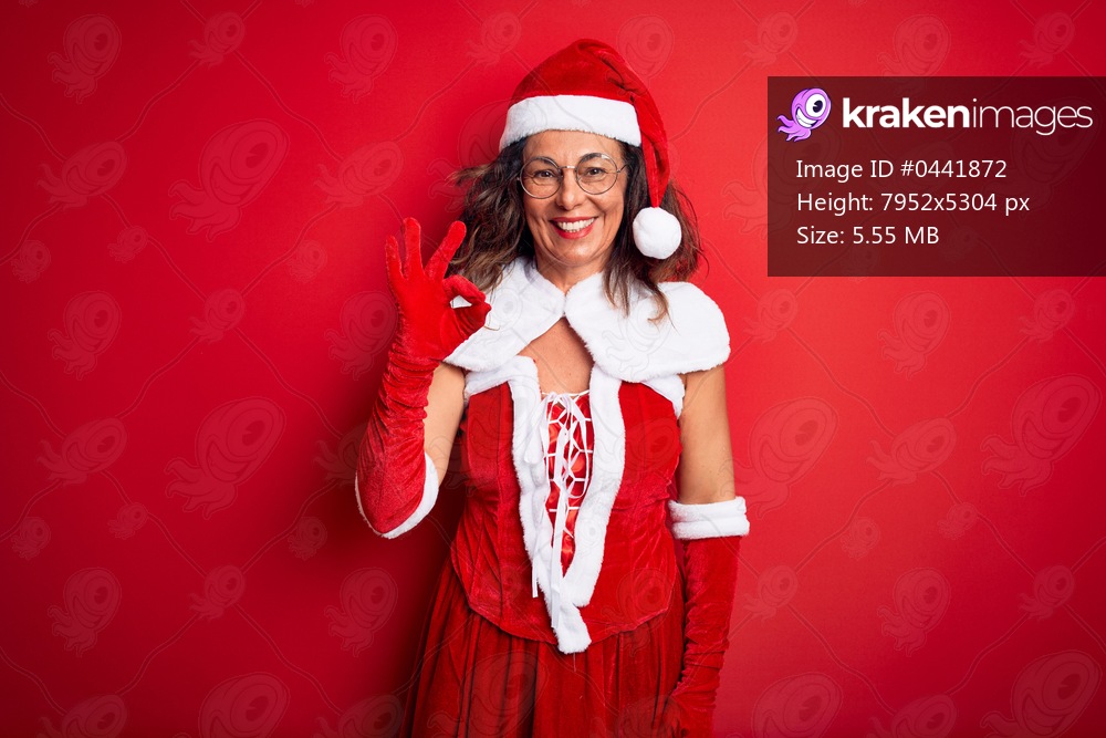 Middle age beautiful woman wearing Santa Claus costume over isolated red background smiling positive doing ok sign with hand and fingers. Successful expression. - Kraken Images