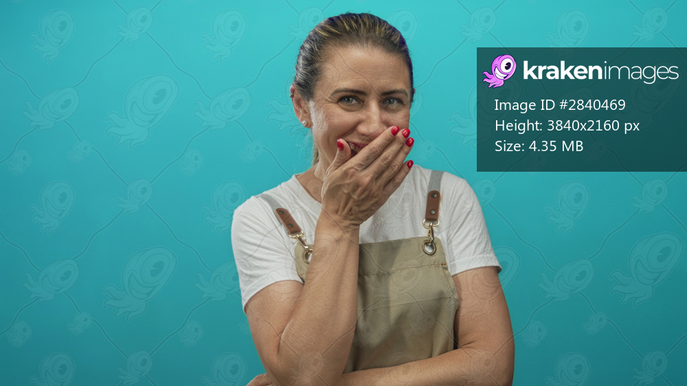 Middle age blond woman wearing beige overalls and white shirt covers mouth with hand while laughing in studio; joy warmth fun connection.
