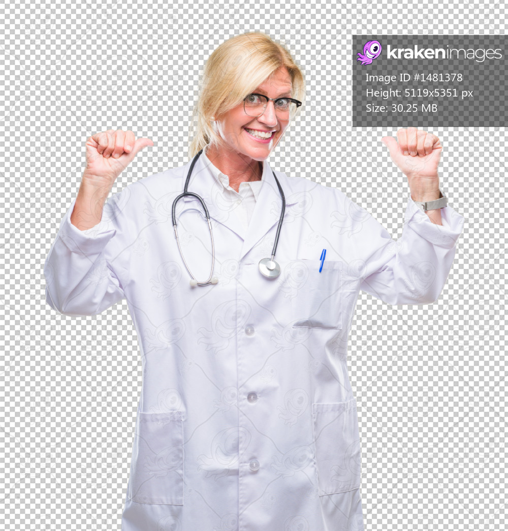 Middle age blonde doctor woman over isolated background looking confident with smile on face, pointing oneself with fingers proud and happy.