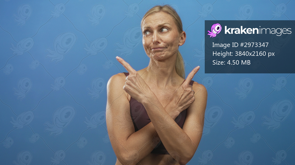 Middle age blonde woman crossing arms with fingers pointing, wearing sports bra in fitness pose against blue studio backdrop; skeptical doubt hesitation. - Kraken Images