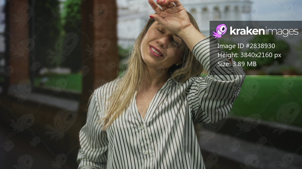 Middle age blonde woman dries sweat from forehead with hand in front of pisa tower building; relief.