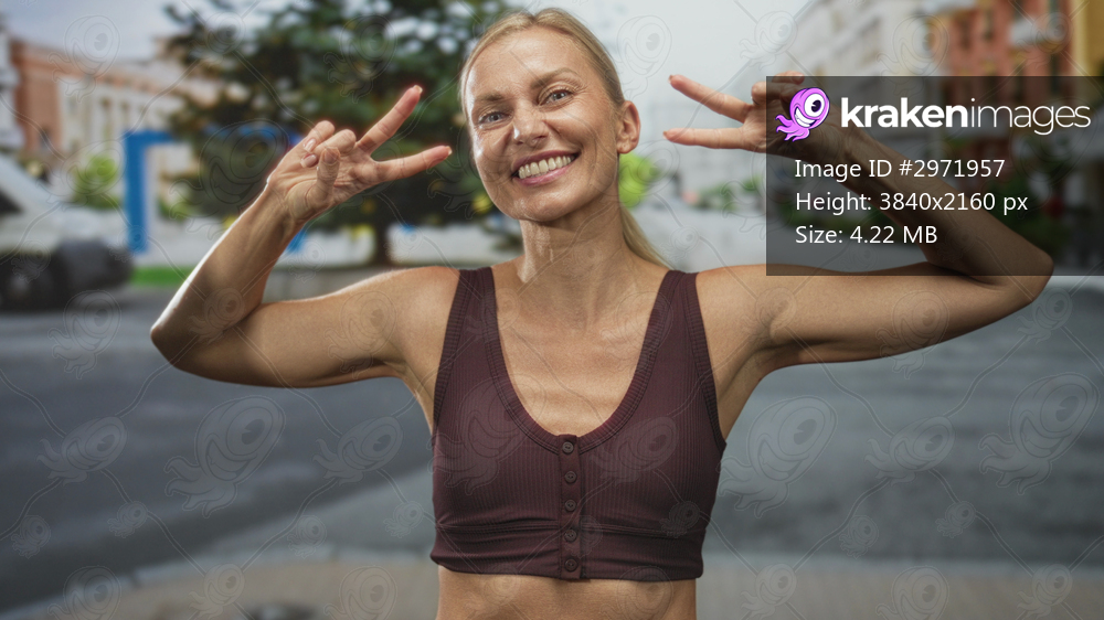 Middle age blonde woman flashing double peace signs, arms raised showing toned biceps and exposed midriff while wearing a sports bra on a street; playful confidence. - Kraken Images