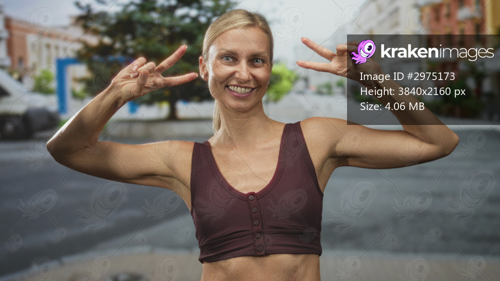 Middle age blonde woman flashing double peace signs, arms raised showing toned biceps and exposed midriff while wearing a sports bra on a street; playful confidence. - Kraken Images