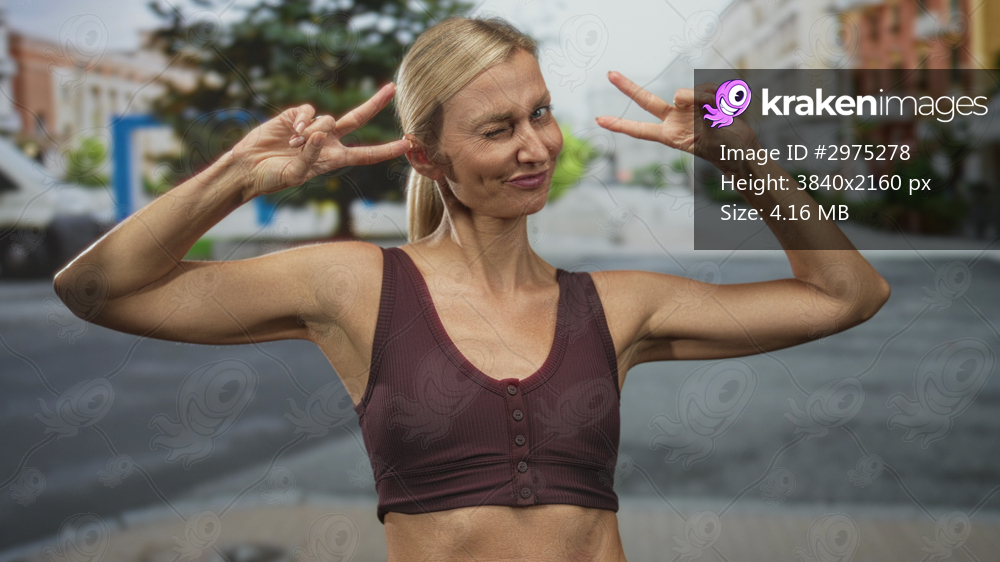 Middle age blonde woman flashing double peace signs, arms raised showing toned biceps and exposed midriff while wearing a sports bra on a street; playful confidence. - Kraken Images